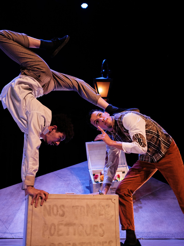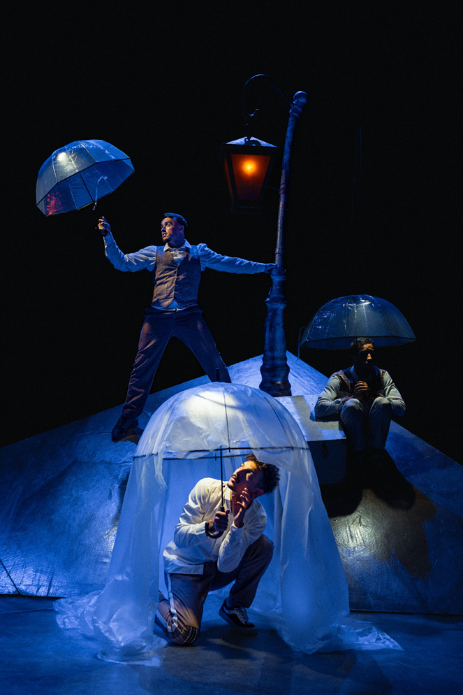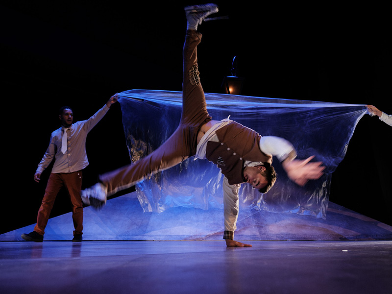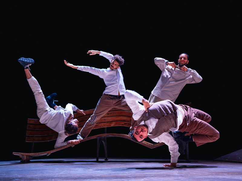 Quatre danseurs s’extraient l’un après l’autre d’une malle en bois poussiéreuse, tels des souvenirs enfouis. On le devine tout de suite : ils sont joueurs, espiègles et pleins de ressources. Sous un lampadaire aux faisceaux de lumières mélancoliques, une trappe s’ouvre, une valise semble voler, d’où surgissent les éléments du passé, objets ou personnages. Ce sont des plumes de souvenirs, des feuilles mortes, des photos, des voiles translucides que saisissent les danseurs acrobates, dans des prodiges d’enchaînements collectifs et des solos poignants. La compagnie Pyramid convoque les gags d’un Buster Keaton, la grâce d’un Michael Jackson, les rêves de Magritte et l’urgence rythmée des danses urbaines. Elle propulse quatre anges dans l’art vivifiant d’un théâtre d’objets et de mime burlesque, magnifiant toujours la fièvre du hip hop.